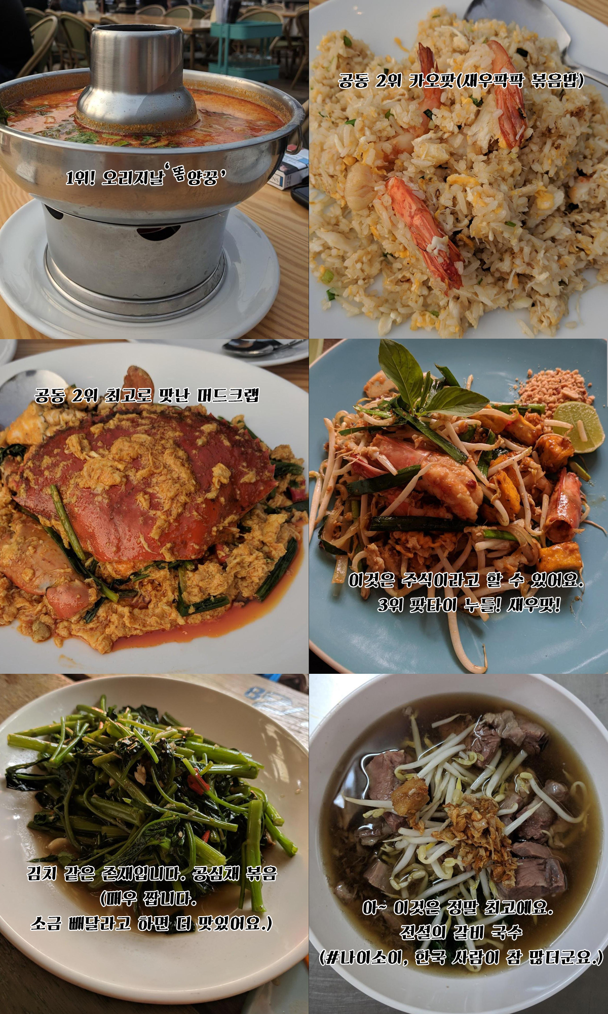 카오팟, 팟타이, 그린 커리, 똠양꿍, 쿠아이 티에우(국수), 쏨땀 등.. 정말 다시는 안 올 것처럼 계속 그리고 또다시 먹고 왔습니다!