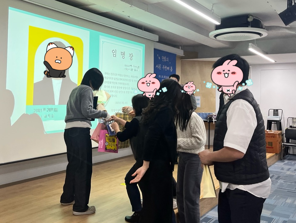미니 이벤트로 분위기가 훈훈해지고 난 뒤 <승진자 임명식> 이 이어졌습니다. ㅎㅎ