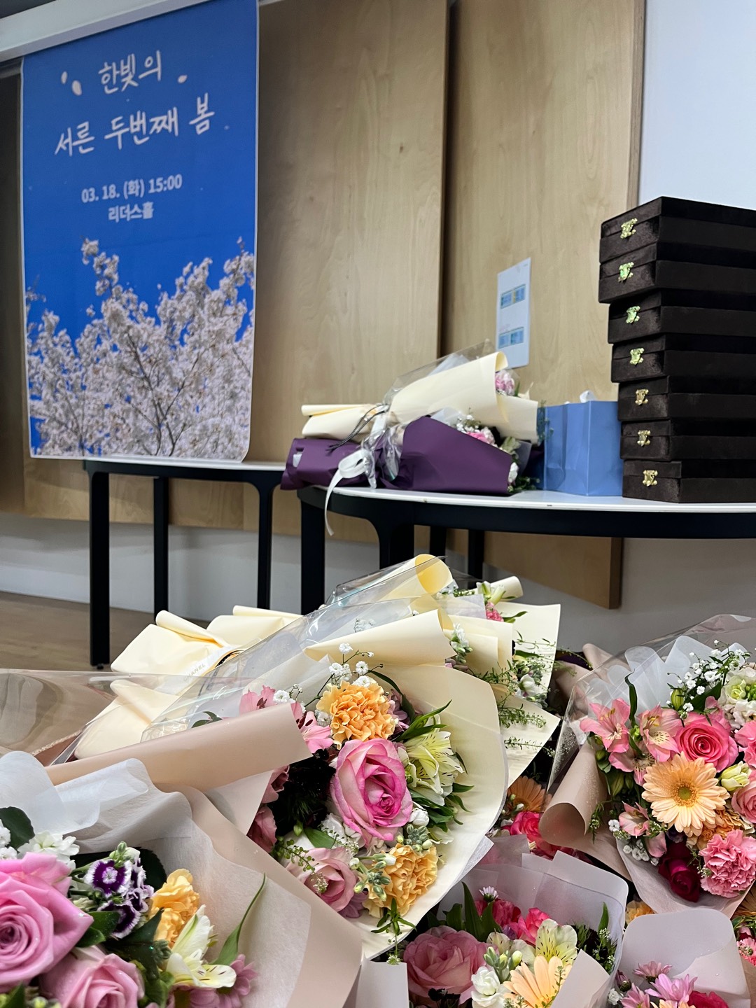 봄을 닮은 예쁜 꽃다발들과 상패들이 보이네요. 👯♀️