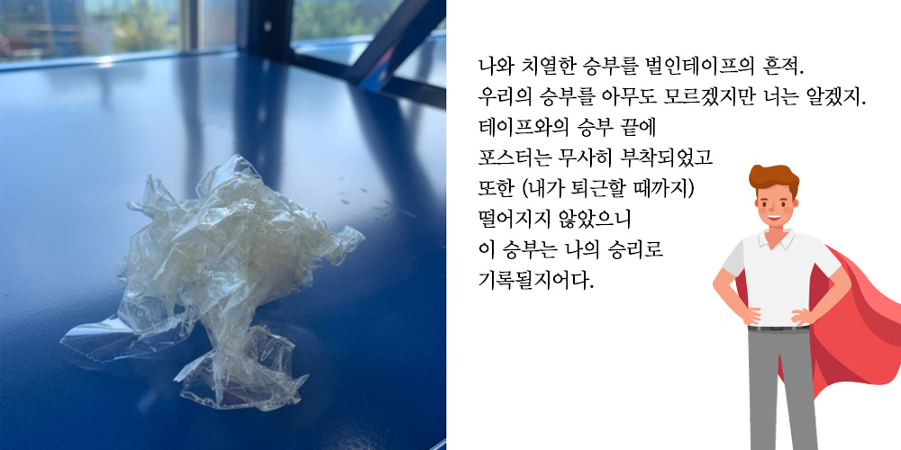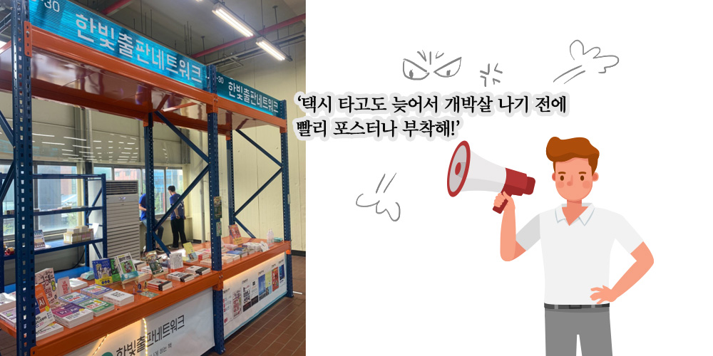 무거운 건 손 만이 아니었다. 도서전으로 향하는 내 어깨 위에는 막중한 임무가 놓여 있었으니. 그건 바로 업마케팅팀에서 제작한 A3 사이즈의 포스터 6장을 무사히 한빛 부스로 운반하고, 비말 차단 스크린에 온전하게 부착하는 것이었다.