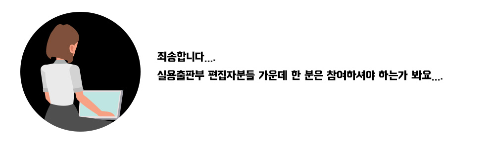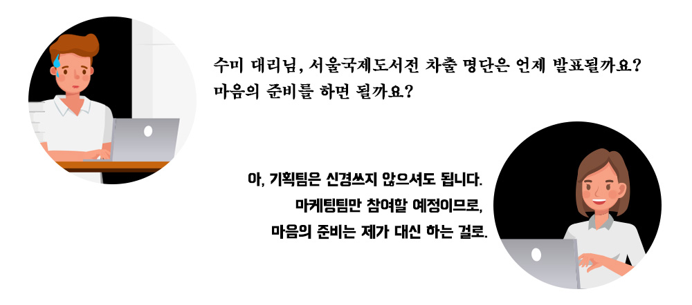 불특정 다수와 만나는 일이 너무나 겁시 나는 내향성 인간인 나… 다급한 마음에 영업마케팅팀 수미 대리님께 문의했다. 수미 대리님은 사원과 대리급 직원 대표로 노사협의회에도 참석하니 왠지 도서전 행사에 능통하시리라 생각했다.