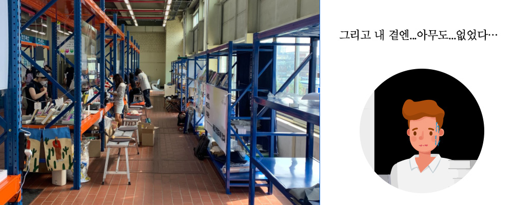 출근할 때부터 느낌이 싸했다. 9월에 도서전이 열리면 한빛도 참가하겠지? 그럼 상주 직원이 필요하고, 그럼 누군가가 가야겠지? 고개를 들어 주위를 살폈다. 입사할 때 다섯 명이던 팀에는 이제 팀장님과 나 둘만 남았다(이건 서바이벌인가?!) 고개를 높게 들어 시야를 A동 5층 전체로 넓혔다. 왠지… 내가 가게 되리라는 강한 느낌적 느낌이 들었다.