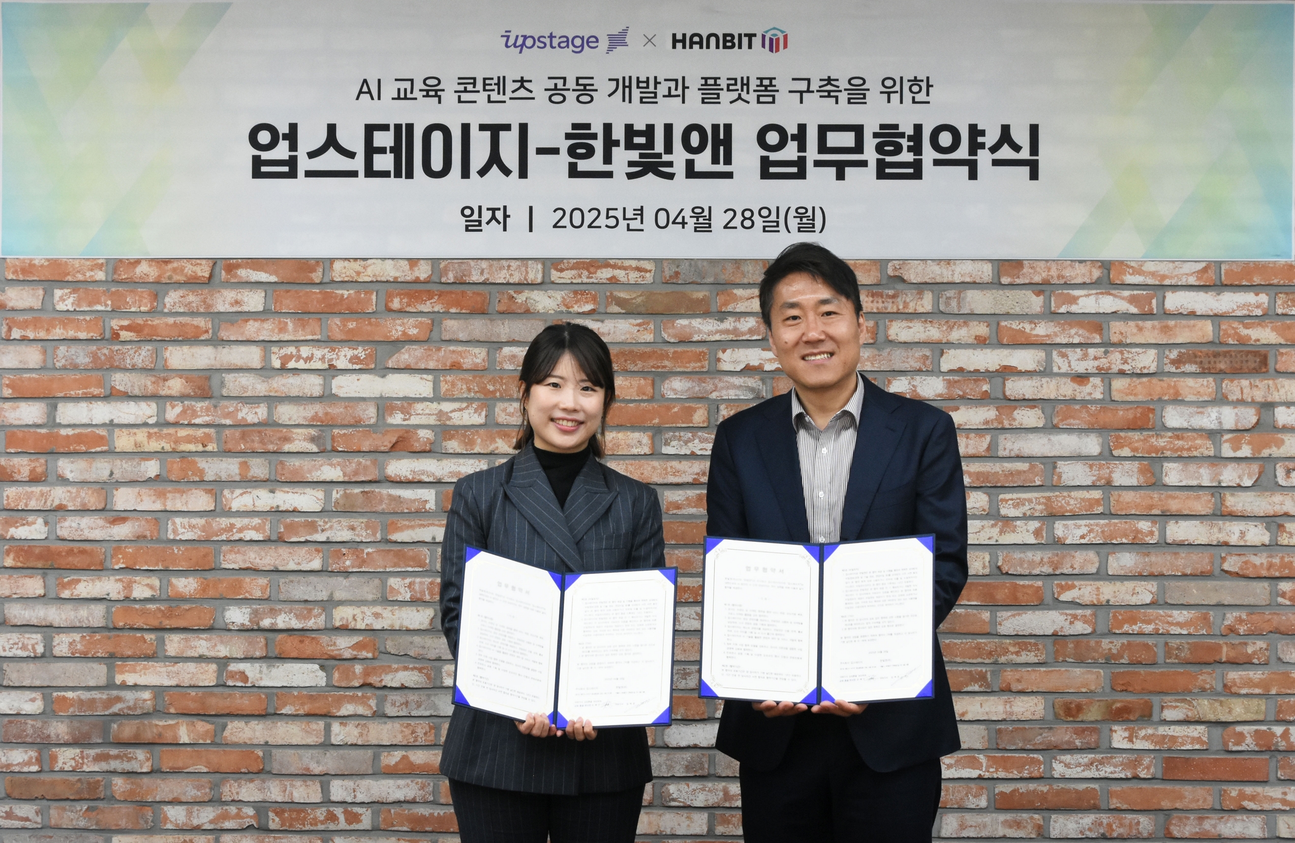 AI 기술 기업 업스테이지(대표 김성훈)와 IT 전문 콘텐츠 기업 한빛앤(대표 임백준)이 2025년 4월 28일, AI 교육 콘텐츠 공동 개발 및 인재 양성을 위한 전략적 업무협약(MOU)을 체결했다.