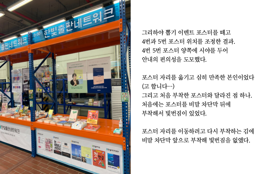 무거운 건 손 만이 아니었다. 도서전으로 향하는 내 어깨 위에는 막중한 임무가 놓여 있었으니. 그건 바로 업마케팅팀에서 제작한 A3 사이즈의 포스터 6장을 무사히 한빛 부스로 운반하고, 비말 차단 스크린에 온전하게 부착하는 것이었다.