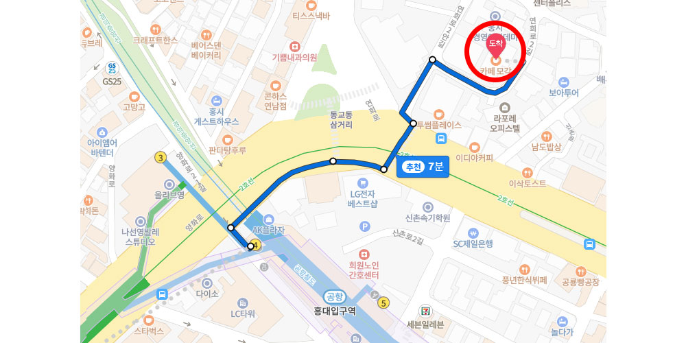 홍대입구역 4번 출구에서 도보로 7분만 가면 도착합니다.(엄청 가깝죠?)